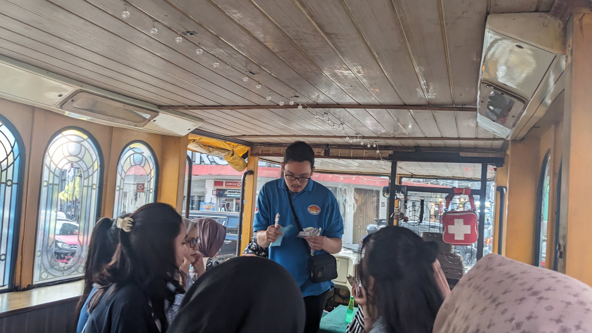 Nous voyons alors un bus touristique, avec lequel nous décidons de faire un tour. Ce n’est pas la meilleure idée que nous ayons eue. Toute la visite était en indonésien, et pas beaucoup de bâtiments remarquables à voir… Le tout dans un confort très sommaire 😅. On croise aussi quelques personnes déguisées dans les rues, un carnaval se prépare pour le lendemain…